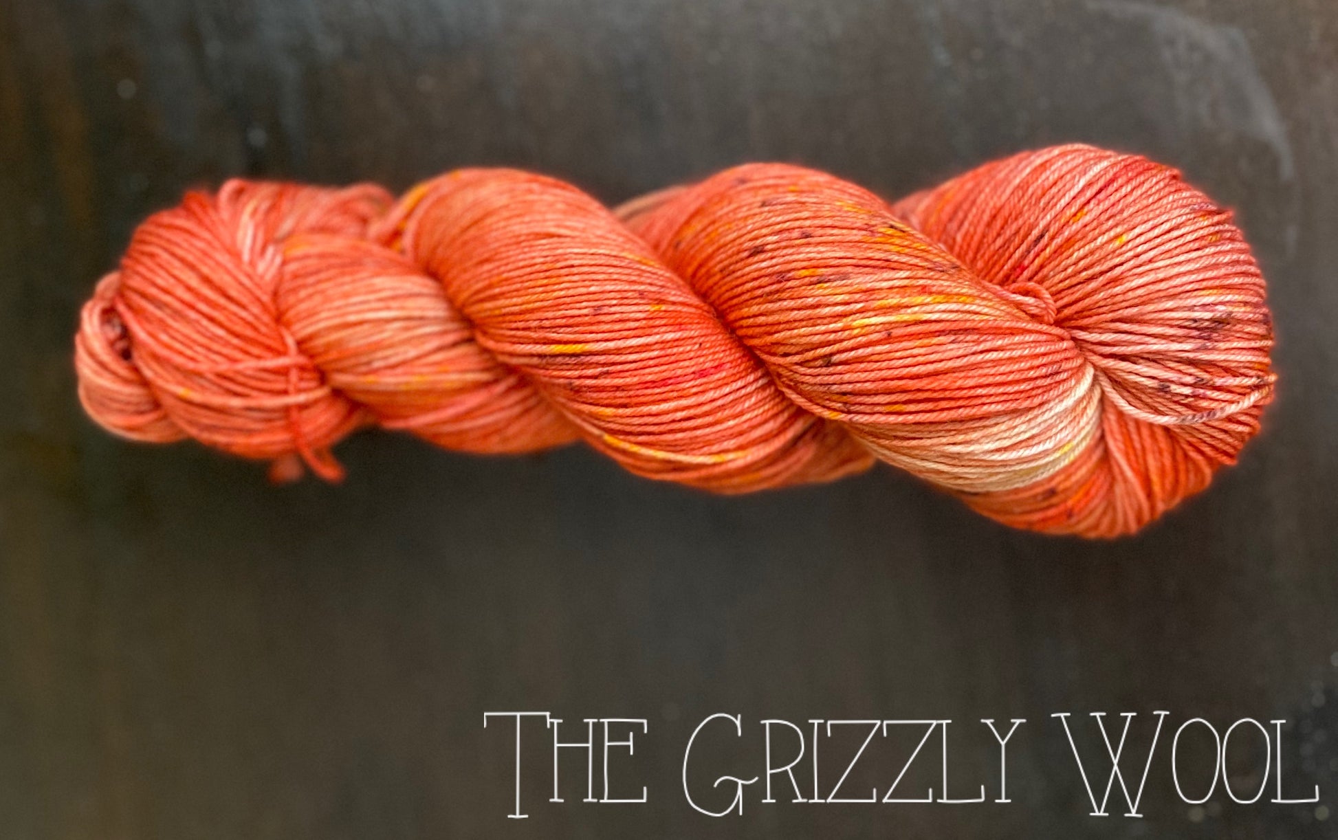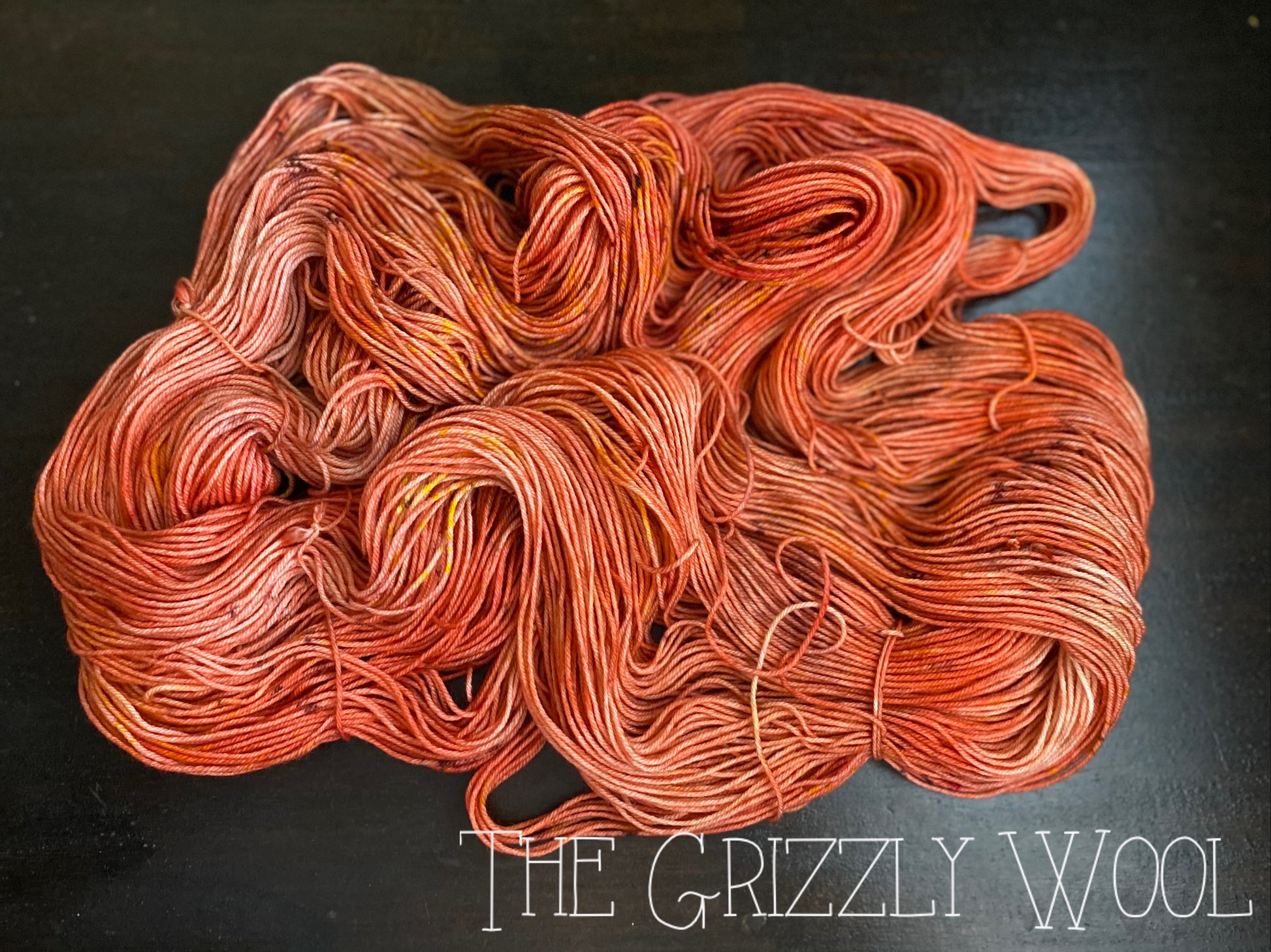 Tiger Lilly is a natural white base dyed in a low immersion process using a combination of bright rich tangerines and soft muted baby pink streaks pair with beautiful chocolate brown, yellow, and peach speckles. The dye is poured directly into a low immersion water bath, because of this the way the dye flows can vary and create purposeful white and/or lighter patches. Each skein is unique. The color way is repeatable HOWEVER every single skein, regardless of dye lot, will vary in how the colors combine and swirl which is what makes hand dyed yarn so unique and beautiful. The colors swirl in the water for a beautiful color pooling effect.